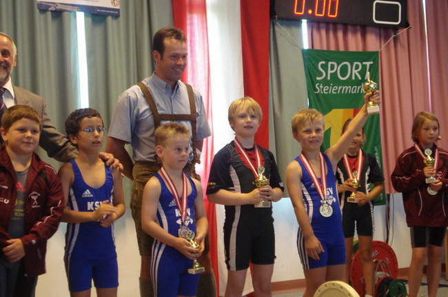 3 Starter - und die Plätze 1 - 2 - 4. Man kann also sagen dass die Ausbeute unserer 3 jüngsten KSV-Athleten optimal war. Bereits um 06.00 Uhr in der Früh erfolgte die Abfahrt in Richtung Öblarn. Mit an Bord die Betreuer Hans Steiner und Werner Uran. Für das leibliche Wohl und die mütterliche Unterstützung sorgte Marion Steiner. Lucas Steiner, Felix Steiner und Hasan Demir waren bei ihrem 1. Start bei einer österreichischen Meisterschaft am Anfang noch sichtlich nervös. Aber man sah gleich nach den Reißkniebeugen, dass sich das Training unter der Leitung von Harald Steiner, Martin Schneider und Werner Uran gelohnt hatte. Alle 3 Jung´s bekamen für ihre Versuche die Höchstmarke von 9,5 Punkten. Anschließend folgten in der Halle die Liegestütze - Lucas, Felix und Hasan kamen auf die Höchstzahl von 25. Leider wurden bei Hasan 3 auf Grund der unsauberen Ausführung gestrichen. Dann ging es auch schon ab zur Leichtathletik - der staatlich geprüfte Trainer Hans Steiner, der in der Vorbereitungsphase für das Leichtathletiktraining zuständig war, wärmte mit den Jung´s auf. Beim 30-Meter-Sprint aus der Bauchlage konnte man erkennen, dass unsere Mini-Herkulesse zu den schnellsten gehören. Lucas und Felix gelang mit 6,5 Sekunden die schnellste Zeit aller Teilnehmer. Dicht gefolgt von Hasan der nur eine Zehntel langsamer war. Beim 3-Hopp-Sprung fixierte Lucas Steiner dann schlussendlich seinen 1. österr. Meister-Titel. Mit 5,31 Metern sprang Lucas am weitesten aller Teilnehmer. Auch Felix mit 4,99 Metern und Hasan mit 4,83 metern konnten persönliche Bestweiten erzielen. Somit hieß es am Ende: 1. Platz - Lucas Steiner mit 37 Punkten, 2. Platz - Felix Steiner mit 35,5 Punkten und der undankbare aber ausgezeichnete 4. Platz für Hasan Demir mit 32,5 Punkten. Anschließend ging es wieder nach Hause. Am Thiersee wurde ein kurzer Badestop eingelegt, da die Busfahrt bei über 30 Grad ziemlich anstrengend war. Nach einer Pizzastärkung ging es ab nach Hause! Zum Schluss noch einmal ein Lob und Danke vom Trainer Werner an alle 3 Jung´s für ihr diszipliniertes und korrektes Auftreten bei der ersten nationalen Meisterschaft!!! | |||||||||||||||||||||||||||||||||||||||||||||||||||||||||||||||||||||||||||||||||||||||||||||||||||