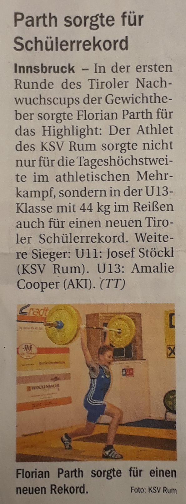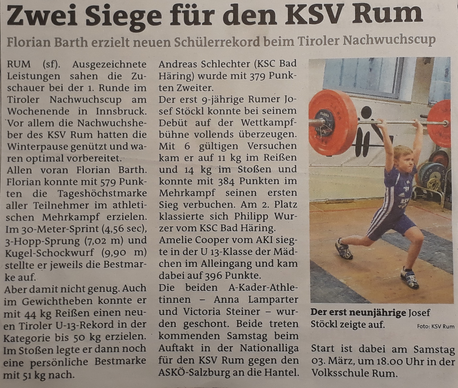 Ausgezeichnete Leistungen sahen die Zuschauer bei der 1. Runde im Tiroler Nachwuchscup am Wochenende in Innsbruck. Vor allem die Nachwuchsheber des KSV-RUM hatten die Winterpause genützt und waren optimal vorbereitet. Allen voran Florian Barth. Florian konnte mit 579 Punkten die Tageshöchstmarke aller Teilnehmer im athletischen Mehrkampf erzielen. Im 30-Meter-Sprint (4,56 sec) - 3-Hopp-Sprung (7,02 m) und Kugel-Schockwurf (9,90 m) stellte er jeweils die Bestmarke auf. Aber damit nicht genug. Auch im Gewichtheben konnte er mit 44 kg Reißen einen neuen Tiroler U-13-Rekord in der Kategorie bis 50 kg erzielen. Im Stoßen legte er dann noch eine persönliche Bestmarke mit 51 kg nach. Andreas Schlechter (KSC Bad Häring) wurde mit 379 Punkten Zweiter. | |||||||||||||||||||||||||||||||||||||||||||||||||||||||||||||||||||||||||||||||||||||||||||||||||||