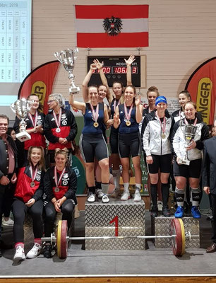 Bericht vom TGV - Sportwart Markus MARKSTEINER Mit einem großartigen Erfolg für den Tiroler Landesverband endete das Finale der Frauen-Bundesliga 2019! Die Tiroler Auswahl mit Steiner Victoria und Lamparter Anna vom KSV-Rum sowie Dörner Rebecca und Kirchner Nadine vom SC Kroftlaggl Kirchbichl konnte durch starke Leistungen den dritten Platz (unter 9 Mannschaften) erreichen. Gratulation aber auch an Nagl Birgit und Richler Vera vom SV Heavy Load Fritzens die mit ihren Leistungen und vielen Sinclairpunkten in der Vorrunde ebenfalls zu diesem tollen Ergebnis beigetragen haben. Die Anfahrt zum Bundesliga-Finale nach Lochen verlief leider nicht ganz nach Wunsch. Beim Vereinsbus vom KSV-Rum verabschiedete sich auf der Autobahn der Keilriemen und man konnte nicht weiter fahren. Schnell wurde telefoniert um Ersatzlösungen zu finden - vielen Dank an dieser Stelle an Lamparter Hannes, Steiner Harald und Giacomuzzi Markus die sich sofort bereit erklärten die "gestrandeten" Athletinnen, Betreuer und Schiedsrichter Huber Manfred pünktlich zum Wettkampf zu bringen - Somit alles gut ausgegangen. Trotz der Panne waren alle Damen bestens motiviert und zeigten tolle Leistungen. In der Finalrunde der besten vier Mannschaften wurde der Wettkampf im Blockheben durchgeführt. Den Anfang machte Dörner Rebecca, die im Zweikampf 107 kg zur Hochstrecke bringen konnte (144,41 Punkte). In der zweiten Runde war mit Kirchner Nadine gleich die nächste Dame der Kroftlaggl an der Hantel. Sie konnte 147,95 Sinclairpunkte in die Wertung bringen (Zweikampf 123 kg). | |||||||||||||||||||||||||||||||||||||||||||||||||||||||||||||||||||||||||||||||||||||||||||||||||||