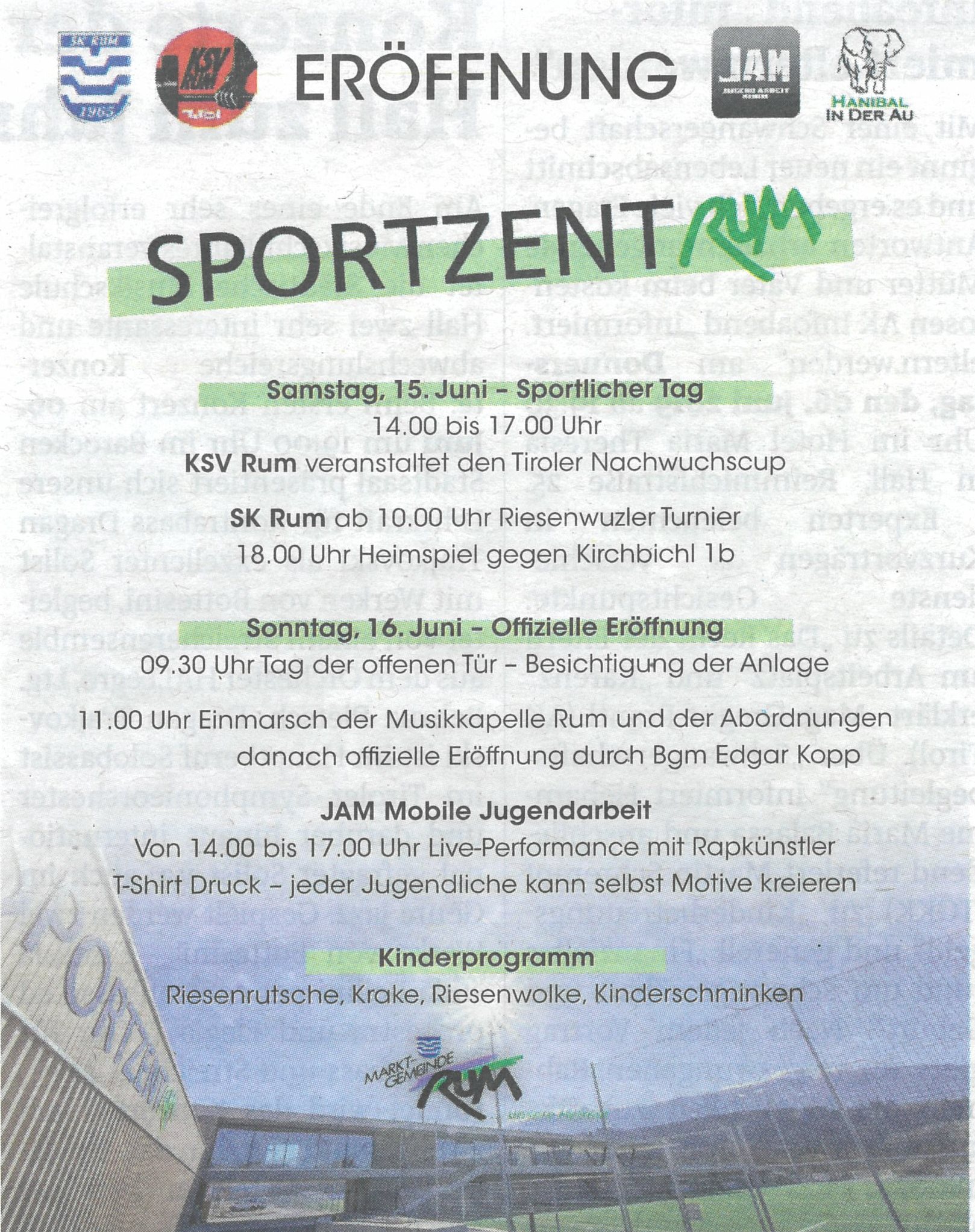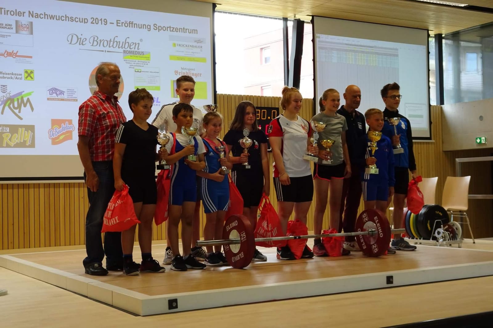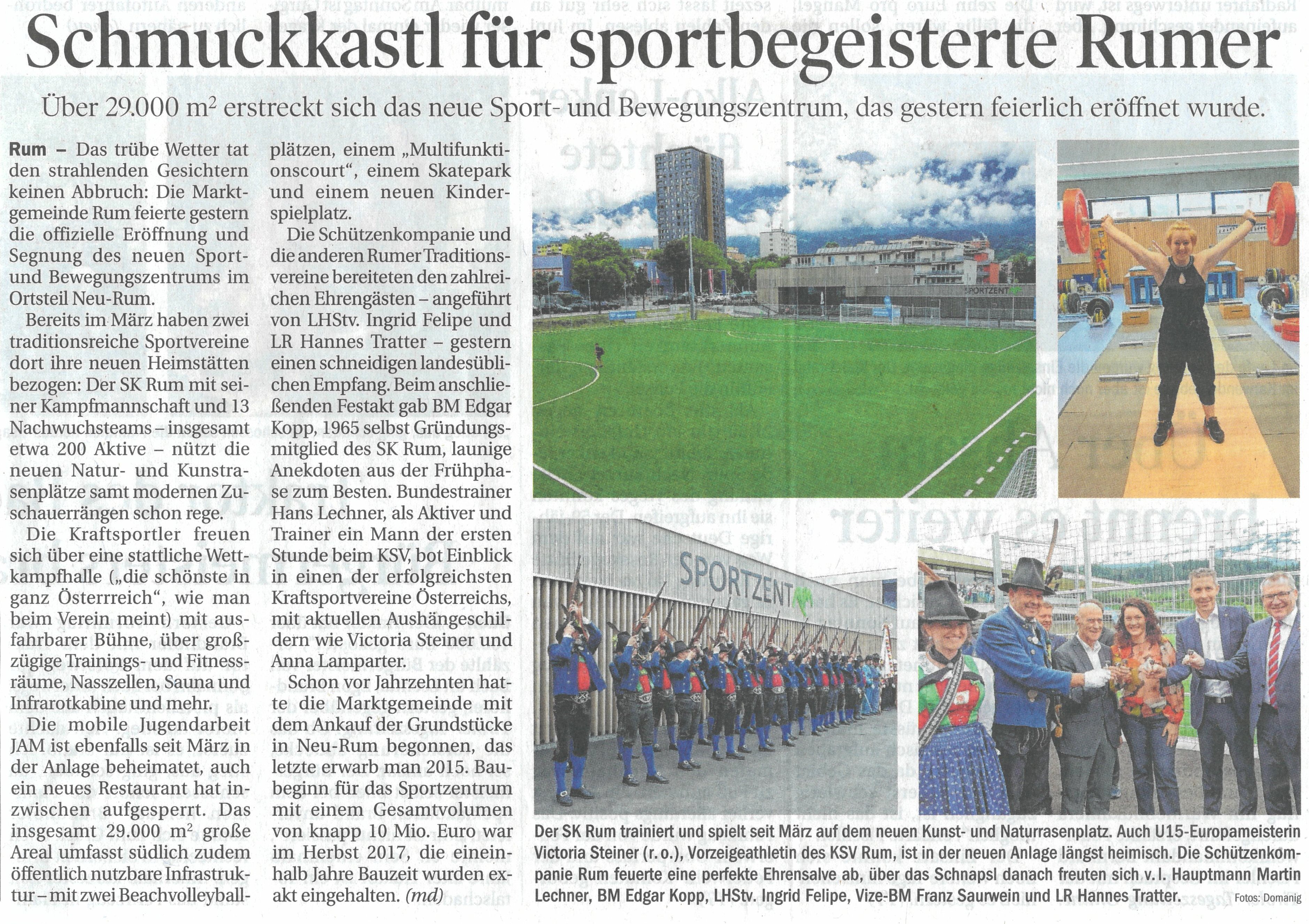 Am 15. und 16. Juni war es so weit. Die offizielle Eröfdfnung des neuen SportzentRUM stand am Programm. Bereits am Samstag fand um 10.00 Uhr das Riesenwuzzler-Turnier statt. Dabei konnte unsere KSV-Mannschaft überzeugen und holte sich den 3. Platz. Am Nachmittag stand die 3. Runde des Tiroler Nachwuchscup´s auf dem Programm. 9 Mädels und Burschen zeigte vor einer vollen Wettkampfhalle ihr Können. Unsere Jung´s konnten dabei vollends überzeugen. Maximilian Aigner konnte seine Bestleistungen gleich um 9 kg nach oben schrauben und siegte mit 16 kg Reißen und 23 kg Stoßen in der U 9 Klasse. Josef Stöckl konnte mit 477 Punkten die Tageshöchstmarke erzielen und verbesserte seine Bestleistungen auf 23 kg Reißen und 31 kg Stoßen. Florian Barth belegte in der U 15 Klasse den 2. Platz hinter dem Häringer Benkö Niclas. Die neue Bestleistung von 51 kg konnte Flo zwar Reißen .... leider flog die Hantel noch vor dem Absignal in Richtung Erde. Victoria Steiner zeigte 6 saubere Versuche und konnte mit 75 kg Reißen und 95 kg Stoßen die Tagesbestmarken erzielen. Anschließend wurde die neue Laufbahn mit den Leichtathletikbewerben eingeweiht. |