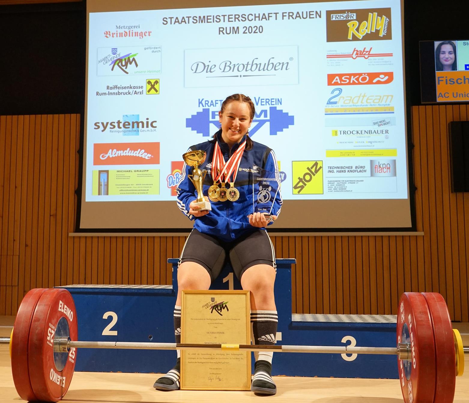 Ohne auch nur einen leisen Zweifel darüber aufkommen zu lassen, verteidigte Victoria Steiner ihre 3 Titel aus dem Vorjahr in der Kat. -76 kg auf heimischer Treppe. Mit 85 kg Reißen - 104 kg Stoßen und 189 kg im Zweikampf feierte Victoria einen überlegenen Sieg und konnte nicht weniger als 20 neue österr. Nachwuchsrekorde (U17 bis U 23) aufstellen. Gleichzeitig waren dies auch neue Tiroler Rekorde. Mit dieser Leistung holte sich Vici auch die Goldmedaille sowie den Tagessieg in der U-17-Wertung. In der Tageswertung der Allgemeinen Klasse belegte sie den 3. Platz. Ein österreichischer Rekordversuch der Allgemeinen Klasse mit 108 kg Stoßen wurde vom Schiedsgericht leider mit 2 : 1 Stimmen als ungültig gewertet, obwohl Vici die Hantel über dem Kopf fixiert hatte.. Nach dem Wettkampf sorgte BGM Edgar Kopp und Vize-BGM Franz Saurwein mit der Überreichung der Sportnadel in GOLD der Marktgemeinde Rum an Victoria für eine schöne Überraschung | ||||||||||||||||||||||||||||||||||||||||||||||||||||||||||||||||||||||||||||||||||||||||||||||||||||||