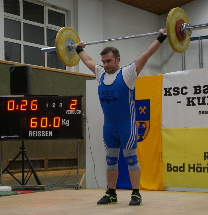 Wohnort - RUM geb. am 14.03.1978 ledig Klasse bis 85 kg Aktiv seit 1991 2-facher Vize-Staatsmeister 2000 in der Kat. - 62 kg 175 kg Zweikampf / 100 kg Stoßen Mehrfacher Tiroler Meister Mehrfacher Tiroler Nachwuchsmeister Bestleistungen: Reißen - 87,5 kg Stoßen - 115 kg Bestleistungen 2006: Reißen - 70 kg Stoßen - 90 kg Bestleistungen 2007: Reißen - 70 kg Stoßen - 90 kg Bestleistungen 2009: Reißen - 72 kg Stoßen - 93 kg Bestleistung 2016 Reißen - 63 kg Stoßen - 77 kg | |||||||||||||||||||||||||||||||||||||||||||||||||||||||||||||||||||||||||||||||||||||||||||||||||