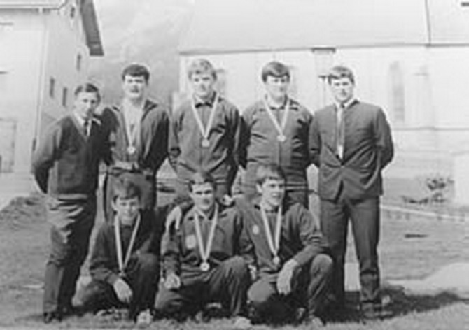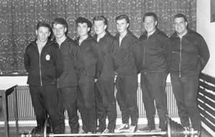 Foto von der Hanteleinweihung im Herbst 1966 - v.l.n.r.: Gründer KERN Franz, LECHNER Hans, GUSCHELBAUER Othmar und Herbert, KLOTZ Anton, GRUBHOFER Helmut u. STRASSER Roland | ||||||||||||||||||||||||||||||||||||||||||||||||||||||||||||||||||||||||||||||||||||||
