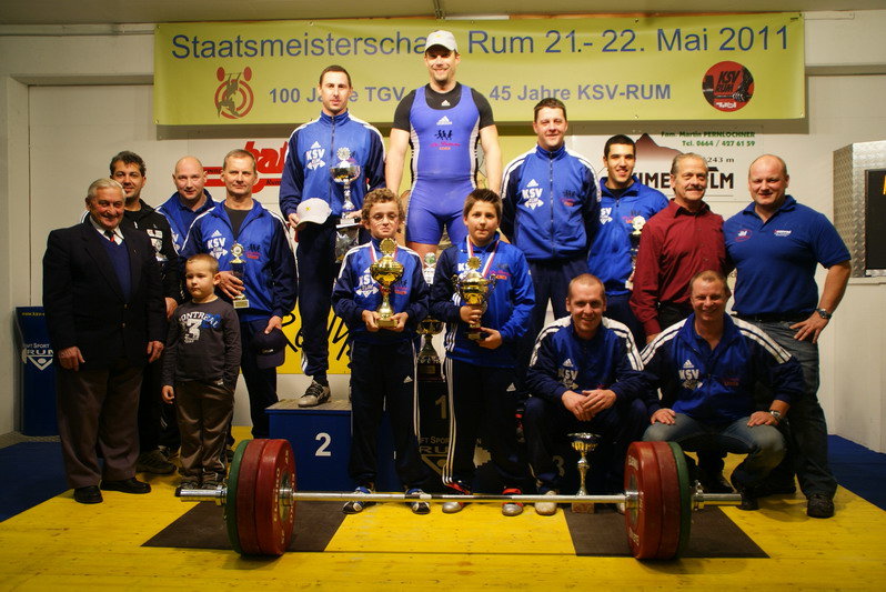 Zum Saisonabschluss kämpften die KSV-Athleten bei der Klubmeisterschaft um die Krone des "stärksten Rumers 2011". Erwartungsgemäß setzte sich in der Klasse "Meister der Meister" Thomas Hölzl mit 296 Punkten an die Spitze. Für den Sieg musste er 122 kg Reißen und 145 kg im Stoßen zur Hochstrecke bringen. 2. wurde nach einem harten Zweikampf Martin Schneider. Mit 107 kg Reißen und 128 kg Stoßen erzielte er eine neue Saisonbestleistung. Mit 288 Punkten setzte er sich gegen den Routinier Hermann Uran knapp durch, der mit 112 kg Reißen und 126 kg Stoßen auf 279 Punkte kam. Dahinter platzierten sich Dietmar Gebhart (235 Pkt.), Gabriel Unsinn (228 Pkt.) und Gerhard Mörth (183 Pkt.) In der Schülerklasse feierte der 13-jährige Lukas Walkam mit den neuen Bestleistungen von 24 kg Reißen und 32 kg Stoßen einen ungefährdeten Sieg. Zweiter wurde Samuel Maier, der erst seit 4 Monaten trainiert. Samuel konnte 21 kg Reißen und 31 kg Stoßen. Mit Manfred Maier - Nationaltrainer der Bobfahrer und Vater von Samuel - kämpfte ein weiterer Rumer um die begehrte Krone des "stärksten Rumers". Mit 85 kg Reißen und 117 kg Stoßen machte er seine Sache ausgezeichnet und erreichte 229 Punkte. Damit zeigte sich wieder einmal mehr, dass viele Sportarten Übungen aus dem Gewichtheben in ihrem Trainingsplan eingebaut haben. | ||||||||||||||||||||||||||||||||||||||||||||||||||||||||||||||||||||||||||||||||||||||||||