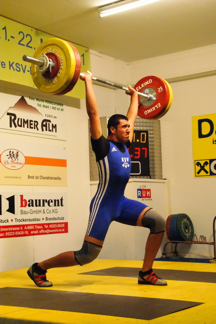 Das 1. Finale der Regionalliga West zwischen dem KSV-RUM und dem KSC Bad Häring hielt was es vor Beginn versprach. Die Zuschauer sahen eine bis zum letzten Versuch spannende Begegnung. Bereits im Reißen konnten sich die Rumer vor heimischen Publikum einen Vorsprung von 13 Punkten erkämpfen. Dieser Vorsprung wurde im Stoßen erfolgreich verteidigt und zudem noch um 2,21 Punkte ausgebaut. Unsere Mannschaft siegte mit 1 : 0 und konnte mit 1381,64 Punkten eine neue Jahresbestleistung erzielen. Der KSC Bad Häring kam auf 1366,41 Punkte. Somit erkämpften sich die Rumer einen Vorsprung von 15,23 Punkte für das 2. Finale, welches am 08. Oktober in Bad Häring statt findet. Bester Athlet auf Rumer Seiten war Thomas Hölzl der mit 120 kg im Reißen und 150 kg im Stoßen auf 295 Punkte kam. Ausgezeichnet in Form zeigte sich Martin Schneider. Er konnte mit 105 kg Reißen und 130 kg Stoßen jeweils neue Bestleistungen erzielen und trug mit 288,9 Punkten wesentlich zum Sieg bei. Markus Marksteiner erreichte mit 128 kg Reißen und 140 kg Stoßen 274,7 Punkte. Mit 6 gültigen Versuchen überraschte Hermann Uran nach seiner überstandenen Knieverletzung (vom Fußball spielen). 107 kg Reißen und 123 kg Stoßen bedeuteten 270,8 Punkte. Leider nur jeweils 1 gültigen Versuch konnte der Jugendathlet Thomas Schweninger mit 84 kg Reißen und 110 kg Stoßen in die Wertung bringen. Trotzdem steuerte er als Ersatzmann wichtige 252,2 Punkte zum Sieg bei. Bester Athlet auf Bad Häringer Seite war Markus Sammer der mit 120 kg Reißen und 137 kg Stoßen auf 300 Punkte kam. Spannung für das 2. Finale ist also garantiert, da beide Mannschaften gleich stark einzuschätzen sind und über den Sieg in der Regionalliga nur die Tagesverfassung entscheiden wird. | |||||||||||||||||||||||||||||||||||||||||||||||||||||||||||||||||||||||||||||||||||||||||||||||||||