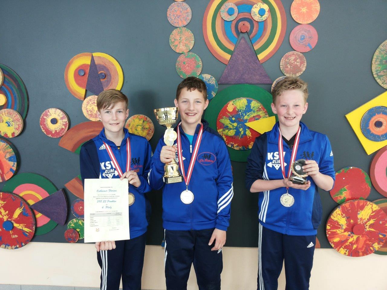Mit schwerem Gepäck konnten die Rumer Nachwuchsathleten die Heimreise von den österreichischen Schülermeisterschaften (Alter 8 bis 13 Jahre) im Gewichtheben und dem athletischen Mehrkampf (3-Hopp-Sprung / Sprint / Kugelschockwurf) aus dem oberösterreichischen Lochen antreten. Mit 4 GOLD, 2 SILBER- und 3 BRONZE-Medaillen gab es das beste Ergebnis seit über einem Jahrzehnt für die Rumer Yougsters - und das alles mit keinem einzigen Fehlversuch im Gewichtheben und durchwegs guten Technikbewertungen! Das regelmäßige Training macht sich bezahlt! Ein großes DANKE an das gesamte Betreuerteam |