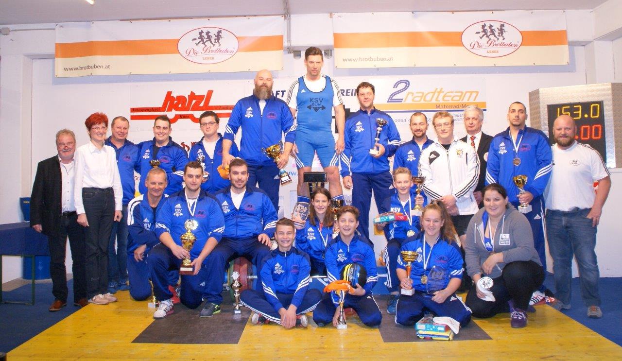 Am Wochenende fand mit der Klubmeisterschaft der letzte Wettkampf für den KSV-RUM im 50. Jubiläumsjahr statt. Vor ca. 100 Zuschauern versuchten alle Kraftpakete noch einmal ihre Bestleistungen nach oben zu schrauben. Dies gipfelte in zahlreichen neuen Bestleistungen und Rekorden. Den Titel "stärkster Rumer 2016" in der Klasse Meister der Meister sicherte sich der Routinier und Dritte der Masters-Weltmeisterschaft Thomas Hölzl. Er kam auf 115 kg Reißen und 125 kg Stoßen und eroberte mit 271 Punkten den begehrten Titel. Am 2. Platz klassierte sich überraschend Markus Giacomuzzi der 252 Punkte auf seinem Konto verbuchen konnte. (103 kg Reißen und 123 kg Stoßen). Dritter wurde Hermann Uran mit 251 Punkten und einer Leistung von 95 kg Reißen und 120 kg Stoßen. 4. Platz - Gerhard Mörth - 207 Punkte (80 kg Reißen / 101 kg Stoßen) 5. Platz - Wolfgang Plank - 184 Punkte (67 kg Reißen / 80 kg Stoßen) 6. Platz - Alexander Plank - 177 Punkte (65 kg Reißen / 85 kg Stoßen) 7. Platz - Lukas Walkam - 162 Punkte (65 kg Reißen / 75 kg Stoßen) Die Frauenklasse konnte die Favoritin Victoria Steiner mit 182 Punkten souverän für sich entscheiden. Als Krönung konnte Victoria mit 61 kg Reißen einen neuen Tiroler Rekord in allen Altersklassen aufstellen. Ebenfalls neue Tiroler Rekorde (U 13 und U 15) erzielte Anna Lamparter mit 39 kg Reißen und 85 kg im Zweikampf. Mit 143 Punkten wurde sie Zweite. Am 3. Platz klassierte sich unser Neuling Nevena Vujmilovic die mit 45 kg Reißen und 60 kg Stoßen jeweils neue Bestleistungen erzielen konnte. Die Schülerklasse gewann Florian Barth mit 153 Punkten vor Maximilian Uran der auf 128 Punkte kam. Beide konnten mit 35 kg Reißen und 74 kg Zweikampf jeweils neue Bestleistung zur Hochstrecke bringen. Die Klubmeisterschaft gewann Stefan Haider mit 209 Punkten und einer Zweikampfmarke von 190 kg. Zweiter wurde unser Springerass Johannes Lamparter der mit 110 kg eine neue Bestleistung aufstellen konnte und so auf 192 Punkte kam. Dritter wurde Dominik Khaschabi mit 190 Punkten (160 kg Zweikampf). Der Favorit auf den Titel Alexandros Nathanailidis schied leider mit einem Totalversager im Reißen aus der Wertung. | ||||||||||||||||||||||||||||||||||||||||||||||||||||||||||||||||||||||||||||||||||||||||||||||||||||||