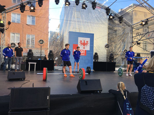 Am Nationalfeiertag durften die Gewichtheber vom KSV-Rum ihre Sportart auf der großen Bühne präsentieren und dem zahlreichen Publikum einen Einblick in das Gewichtheben zeigen. Steiner Victoria - Lamparter Anna - Barth Florian und Stöckl Josef zeigten eine tolle Vorstellung und die Zuschauer waren restlos begeistert! Ein großes DANKE an unseren Moderator Markus Marksteiner der wie gewohnt die Stimme der Gewichtheber war. Herzliche Gratulation zu diesem tollen Auftritt!! |