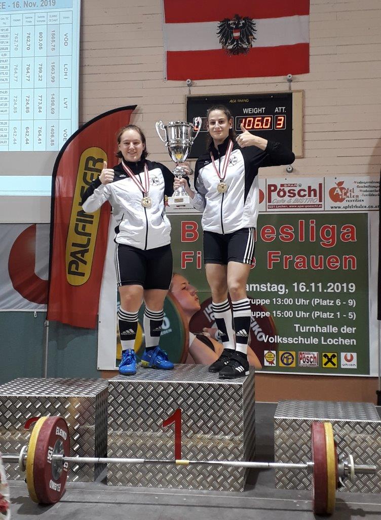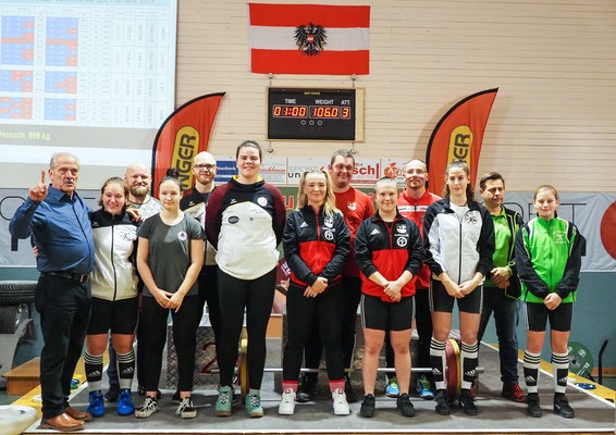 Bericht vom TGV - Sportwart Markus MARKSTEINER Mit einem großartigen Erfolg für den Tiroler Landesverband endete das Finale der Frauen-Bundesliga 2019! Die Tiroler Auswahl mit Steiner Victoria und Lamparter Anna vom KSV-Rum sowie Dörner Rebecca und Kirchner Nadine vom SC Kroftlaggl Kirchbichl konnte durch starke Leistungen den dritten Platz (unter 9 Mannschaften) erreichen. Gratulation aber auch an Nagl Birgit und Richler Vera vom SV Heavy Load Fritzens die mit ihren Leistungen und vielen Sinclairpunkten in der Vorrunde ebenfalls zu diesem tollen Ergebnis beigetragen haben. Die Anfahrt zum Bundesliga-Finale nach Lochen verlief leider nicht ganz nach Wunsch. Beim Vereinsbus vom KSV-Rum verabschiedete sich auf der Autobahn der Keilriemen und man konnte nicht weiter fahren. Schnell wurde telefoniert um Ersatzlösungen zu finden - vielen Dank an dieser Stelle an Lamparter Hannes, Steiner Harald und Giacomuzzi Markus die sich sofort bereit erklärten die "gestrandeten" Athletinnen, Betreuer und Schiedsrichter Huber Manfred pünktlich zum Wettkampf zu bringen - Somit alles gut ausgegangen. Trotz der Panne waren alle Damen bestens motiviert und zeigten tolle Leistungen. In der Finalrunde der besten vier Mannschaften wurde der Wettkampf im Blockheben durchgeführt. Den Anfang machte Dörner Rebecca, die im Zweikampf 107 kg zur Hochstrecke bringen konnte (144,41 Punkte). In der zweiten Runde war mit Kirchner Nadine gleich die nächste Dame der Kroftlaggl an der Hantel. Sie konnte 147,95 Sinclairpunkte in die Wertung bringen (Zweikampf 123 kg). | |||||||||||||||||||||||||||||||||||||||||||||||||||||||||||||||||||||||||||||||||||||||||||||||||||