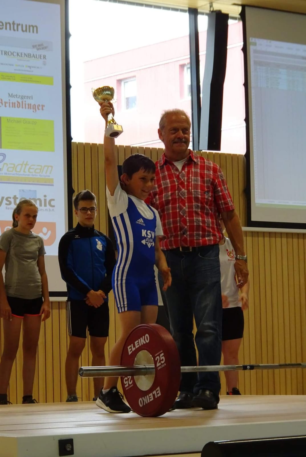 Am 15. und 16. Juni war es so weit. Die offizielle Eröfdfnung des neuen SportzentRUM stand am Programm. Bereits am Samstag fand um 10.00 Uhr das Riesenwuzzler-Turnier statt. Dabei konnte unsere KSV-Mannschaft überzeugen und holte sich den 3. Platz. Am Nachmittag stand die 3. Runde des Tiroler Nachwuchscup´s auf dem Programm. 9 Mädels und Burschen zeigte vor einer vollen Wettkampfhalle ihr Können. Unsere Jung´s konnten dabei vollends überzeugen. Maximilian Aigner konnte seine Bestleistungen gleich um 9 kg nach oben schrauben und siegte mit 16 kg Reißen und 23 kg Stoßen in der U 9 Klasse. Josef Stöckl konnte mit 477 Punkten die Tageshöchstmarke erzielen und verbesserte seine Bestleistungen auf 23 kg Reißen und 31 kg Stoßen. Florian Barth belegte in der U 15 Klasse den 2. Platz hinter dem Häringer Benkö Niclas. Die neue Bestleistung von 51 kg konnte Flo zwar Reißen .... leider flog die Hantel noch vor dem Absignal in Richtung Erde. Victoria Steiner zeigte 6 saubere Versuche und konnte mit 75 kg Reißen und 95 kg Stoßen die Tagesbestmarken erzielen. Anschließend wurde die neue Laufbahn mit den Leichtathletikbewerben eingeweiht. |
