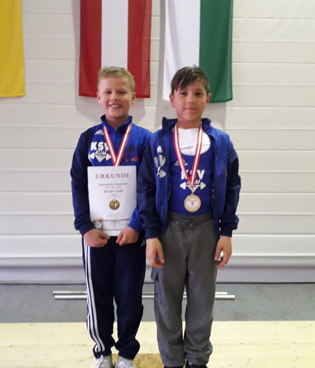 Einen großartigen Erfolg konnten unsere beiden Jüngsten Nachwuchshoffungen bei den österr. Schülermeisterschaften im steirischen Öblarn feiern! Maximilian Aigner - mit seinen 8 Jahren der Jüngste im ganzen Starterfeld - konnte sich gegen seine älteren Gegener durchsetzen und holte sich mit 372,9 Punkten die Goldmedaille im athletischen Mehrkampf der U 9 Wertung! Hier hat sich wieder einmal gezeigt, wie wichtig die allgemeine Körperausbildung ist. Maxi war im Sprint mit 5,7 sec und im Kugelwurf mit 6,92 der Schnellste bzw. Weiteste. Im 3-Hopp-Sprung musste er sich mit dem 2. Platz begnügen... Mit guten 5,02 Metern fehlten nur 10 cm damit er der Weiteste gewesen wäre. Einfach nur supi!! Josef Stöckl (10 Jahre alt) wollte da natürlich nicht nachstehen. Bereits im Gewichtheben konnte er sich mit 20 kg im Reißen und 27 kg im Stoßen die vielumjubelte Goldmedaille sichern. Mit 189,5 Punkten erreichte er die höchste Punkteanzahl der gesamten Altersgruppe! 4,5 von 5 erreichbaren Punkten in der Technikwertung war die Höchstwertung in dieser Gruppe - sie wurde nur 2 mal bei insgesamt 66 Versuchen vergeben. Und Josef bekam die 4,5 für seinen 18 kg Versuch im Reißen! Bravo Josef In der Leichtathletik konnte Josef seinen Vorsprung aus dem Gewichtheben noch ausbauen und siegte schlussendlich mit 448,7 Punkten überlegen auch im Mehrkampf. Sein Vorsprung auf den Zweitplatzierten betrug 50 Punkte! Somit darf sich Josef stolz als 2 - facher österr. Schülermeister feiern lassen. Hier sieht man wieder wie wichtig eine gute Technik ist! Ein großes DANKE an alle die mit den Jung´s so fleißig trainieren!! | |||||||||||||||||||||||||||||||||||||||||||||||||||||||||||||||||||||||||||||||||||||||||||||||||||||