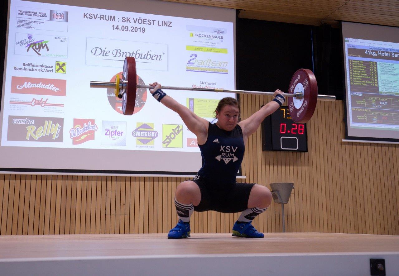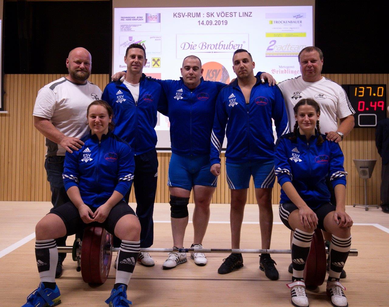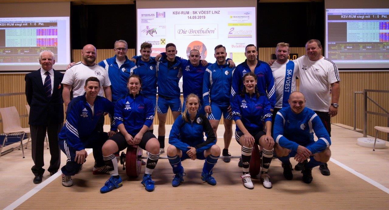 Am 14. September stand im SportzentRUM der Spitzenkampf in der 3. höchsten Gewichtheber-Liga Österreichs auf dem Programm. Dabei trafen vor ca. 100 begeisterten Zuschauern die beiden ungeschlagenen Mannschaften KSV-RUM und SK Vöest Linz 3 aufeinander. Bereits im Reißen entwickelte sich ein spannender Wettkampf um jeden Kilo und Punkt. Dabei konnten die Rumer Mannschaft einen Vorsprung von 15,2 Punkten herausholen. Dieser Vorsprung konnte im Stoßen sogar noch ausgebaut werden. Schlussendlich stand ein hart erkämpfter 1 : 0 Sieg des KSV-RUM mit einem Plus von 43,9 Punkten zu Buche. Mit 1336,3 Punkten blieb die Rumer Staffel nur knapp unter ihrer Saisonbestleistung. Trotz der Niederlage liegt der SK Vöest derzeit noch mit 8 Punkten an der Tabellenspitze, da sie bereits alle Begegnungen absolviert haben. Der KSV-RUM liegt ungeschlagen mit 3 Siegen und 7 Punkten am 2. Platz. Mit einem Auswärtssieg im letzten Wettkampf gegen Union Lifters Dornbirn im Oktober kann sich der KSV-RUM jedoch den Titel der Regionalliga West sichern. | |||||||||||||||||||||||||||||||||||||||||||||||||||||||||||||||||||||||||||||||||||||||||||||||||||||