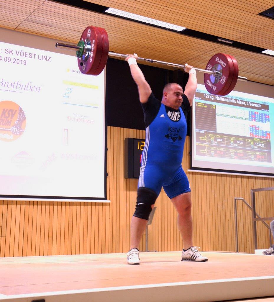 Alexandros Nathanailidis fixierte als unser Schlussheber den vielumjubelten Sieg mit einer fehlerlosen Serie im Stoßen (127 kg) Dominik Khaschabi rückte kurzfristig in die Mannschaft auf, da Fixstarter Hermann Uran verletzt passen musste. Trotz großer Nervosität machte Dominik seine Sache ausgezeichnet und brachte 5 gültige Versuche in die Wertung. Die restlichen Leistungen der Rumer Staffel: Alexandros Nathanailidis - 241,2 Punkte (100 kg Reißen / 127 kg Stoßen) Martin Schneider - 233,9 Punkte (88 kg Reißen / 105 kg Stoßen) Dominik Khaschabi - 211,4 Punkte (75 kg Reißen / 101 kg Stoßen) Stärkster Athlet auf Seiten der Linzer Staffel war Florian Hofwimmer mit 278 Punkten. | |||||||||||||||||||||||||||||||||||||||||||||||||||||||||||||||||||||||||||||||||||||||||||||||||||||