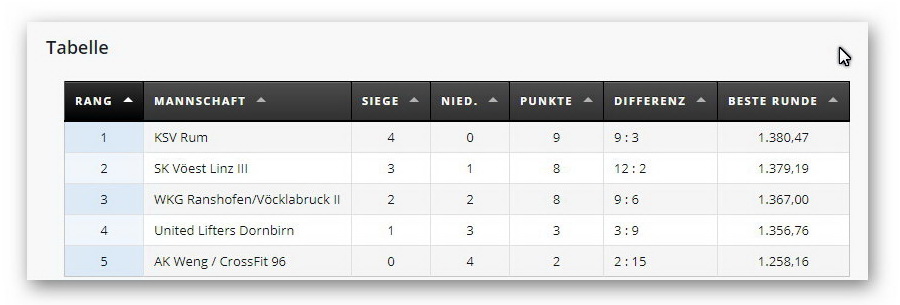Die restlichen Leistungen der Rumer Staffel: Anna Lamparter - 274,2 Punkte (62 kg Reißen / 75 kg Stoßen) Alexandros Nathanailidis - 244,4 Punkte (104 kg Reißen / 125 kg Stoßen) Martin Schneider - 245,4 Punkte (93 kg Reißen / 110 kg Stoßen) Hermann Uran - 237,6 Punkte (98 kg Reißen / 110 kg Stoßen) Stärkster Athlet auf Seiten der Dornbirner Staffel war Sultan Aliev mit 309,6 Punkten. | ||||||||||||||||||||||||||||||||||||||||||||||||||||||||||||||||||||||||||||||||||||||||||||||||||||