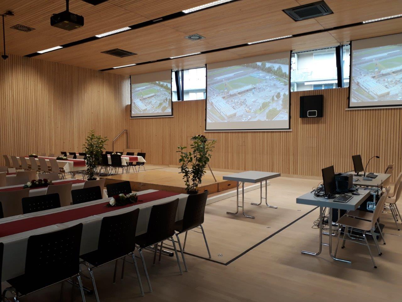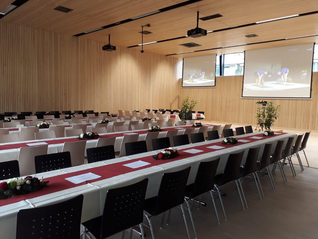 Wir dürfen mit Stolz sagen nun eines der modernsten Trainingszentren von Österreich zu beziehen. Eine Wettkampfhalle mit der 8 x 8 Meter großen und versenkbaren Bühne, der Trainingsraum mit 6 Einzeltreppen und 1 langen Bahn für 5 Trainingsplätze, dem Fitnessraum, Sauna und Infrarotkabine sowie der 60-Meter-Laufbahn für die Leichtathletikbewerbe im Nachwuchsbereich.