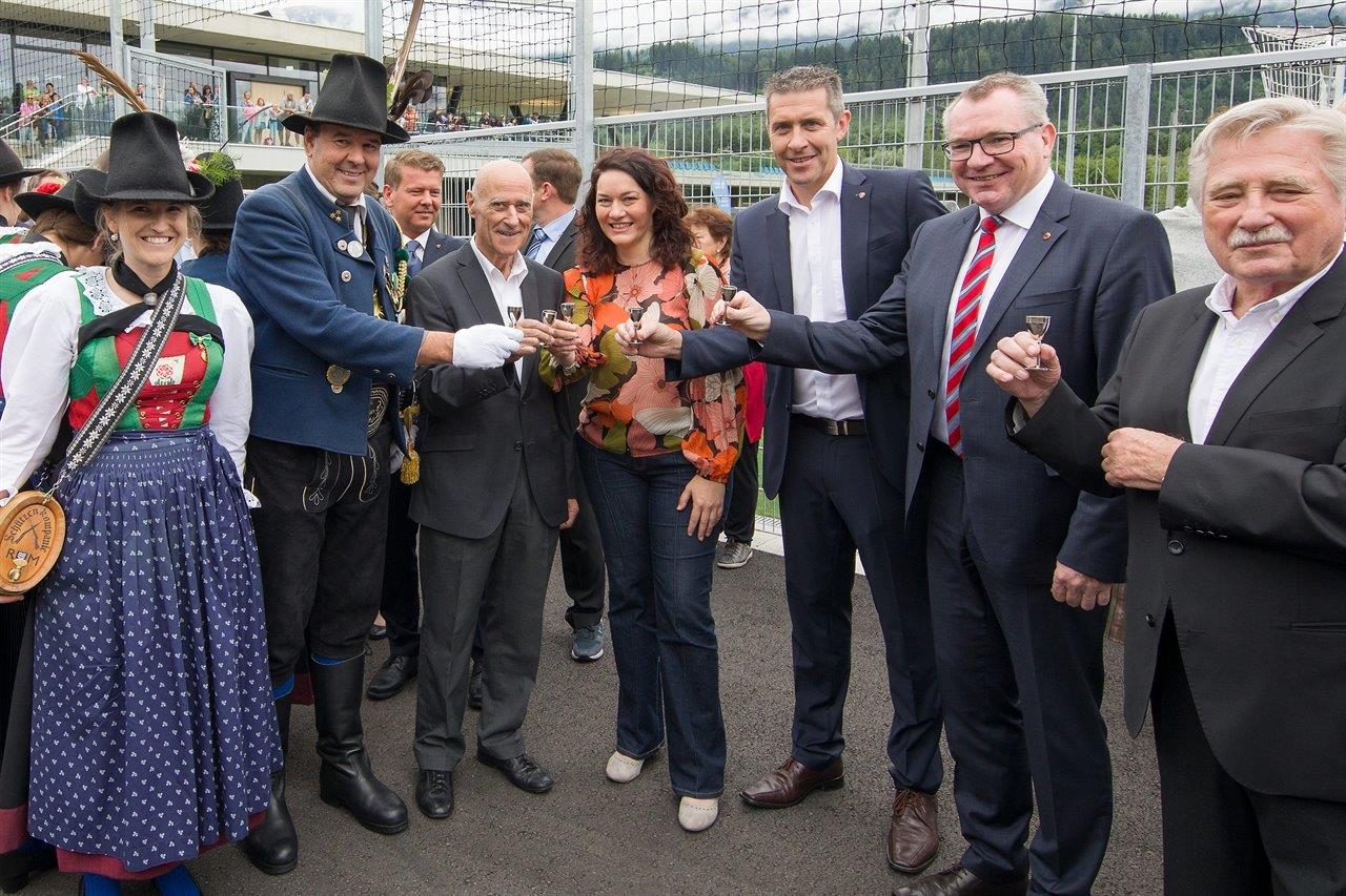 Schützenhauptmann Martin LECHNER - BGM Edgar Kopp - LH-StV Ingrid FELIPE - Vize-BGM Franz SAURWEIN - LR TRATTER - Moderator Peter WYK beim Schnapsl | |