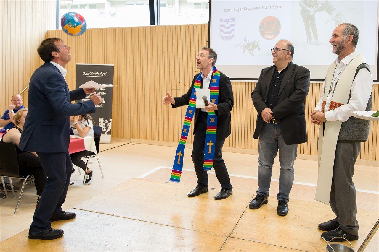 die Pfarrer zeigten sich von ihrer sportlichen Seite vor der Segnung des neuen Sportzentrum | |