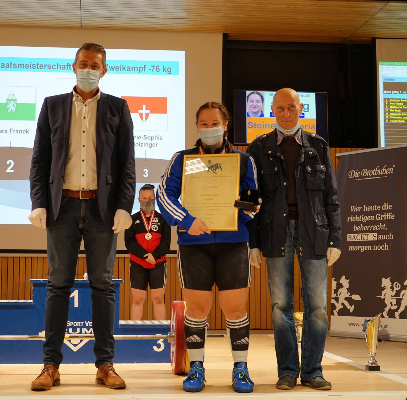 Ohne auch nur einen leisen Zweifel darüber aufkommen zu lassen, verteidigte Victoria Steiner ihre 3 Titel aus dem Vorjahr in der Kat. -76 kg auf heimischer Treppe. Mit 85 kg Reißen - 104 kg Stoßen und 189 kg im Zweikampf feierte Victoria einen überlegenen Sieg und konnte nicht weniger als 20 neue österr. Nachwuchsrekorde (U17 bis U 23) aufstellen. Gleichzeitig waren dies auch neue Tiroler Rekorde. Mit dieser Leistung holte sich Vici auch die Goldmedaille sowie den Tagessieg in der U-17-Wertung. In der Tageswertung der Allgemeinen Klasse belegte sie den 3. Platz. Ein österreichischer Rekordversuch der Allgemeinen Klasse mit 108 kg Stoßen wurde vom Schiedsgericht leider mit 2 : 1 Stimmen als ungültig gewertet, obwohl Vici die Hantel über dem Kopf fixiert hatte.. Nach dem Wettkampf sorgte BGM Edgar Kopp und Vize-BGM Franz Saurwein mit der Überreichung der Sportnadel in GOLD der Marktgemeinde Rum an Victoria für eine schöne Überraschung | ||||||||||||||||||||||||||||||||||||||||||||||||||||||||||||||||||||||||||||||||||||||||||||||||||||||
